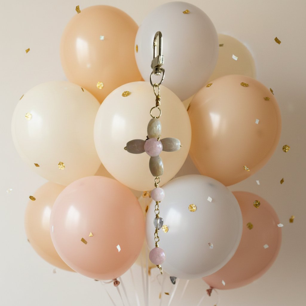 Each of the 8 carefully selected beads contributes to the charm's unique energy. The exquisite pendant size of 33x33mm showcases the natural beauty of these stones, while the length of approximately 13cm makes it a perfect, unobtrusive addition to your keys, purse, or backpack. The charm is secured with a stylish and durable keychain lobster clasp closure in plated 18k gold, ensuring both security and a touch of luxury.