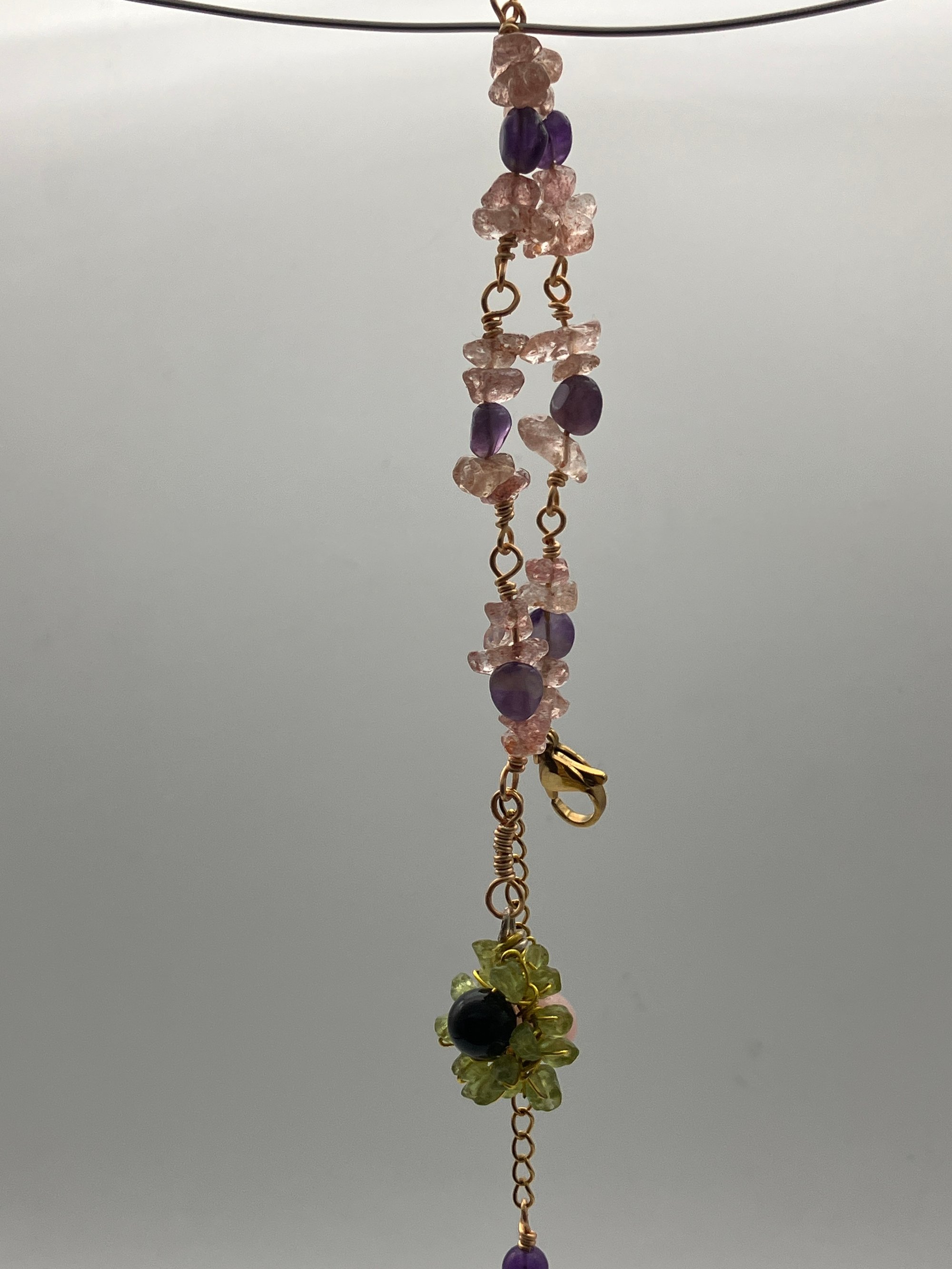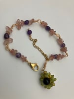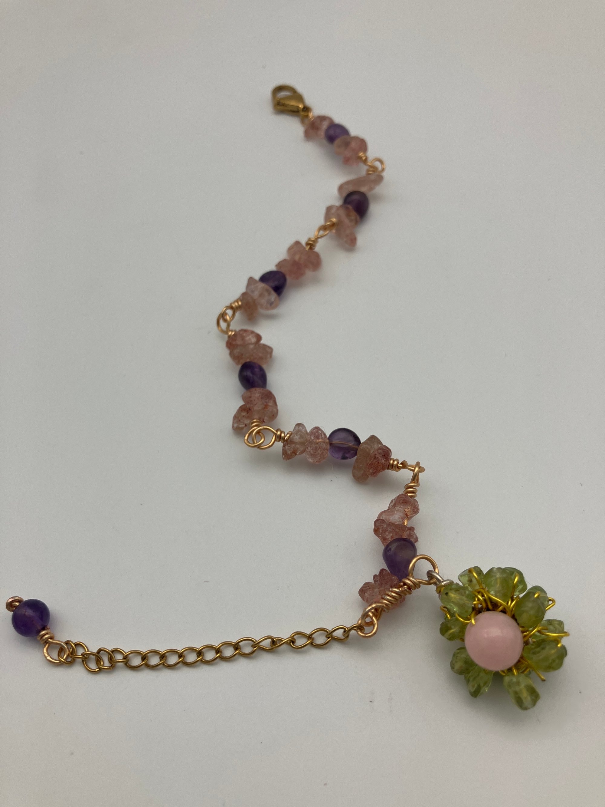 Peridot Rosary Flower Power bracelet featuring strawberry quartz and amethyst